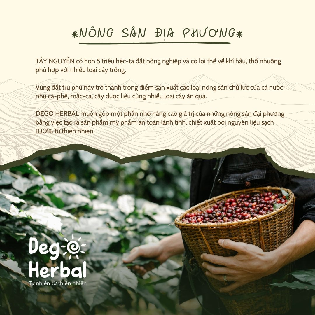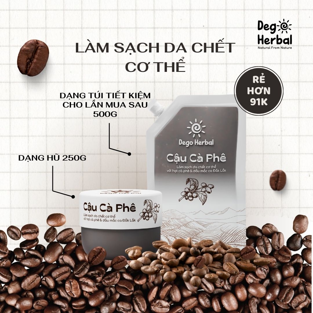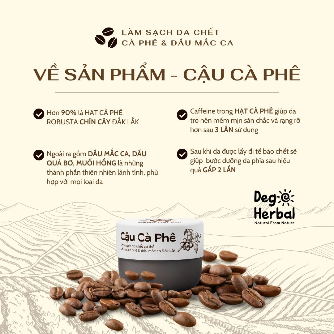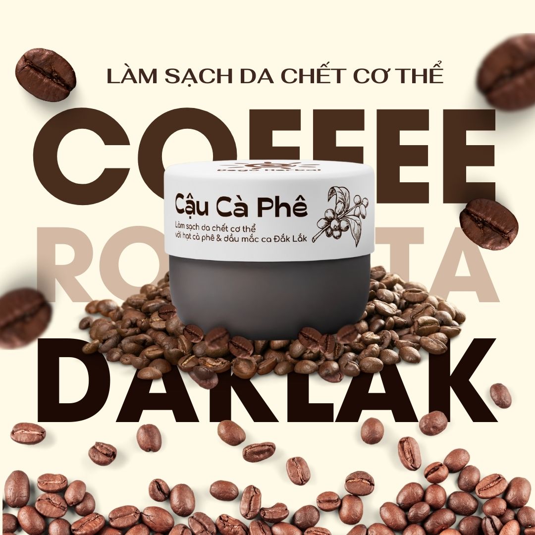 Từ những quả cà phê nguyên chất Đắk Lắk, Dego đã mang đến sản phẩm tẩy tế bào chết "Cậu Cà Phê" – một món quà đặc biệt từ thiên nhiên, giúp làn da bạn luôn mềm mại, mịn màng và tươi sáng.