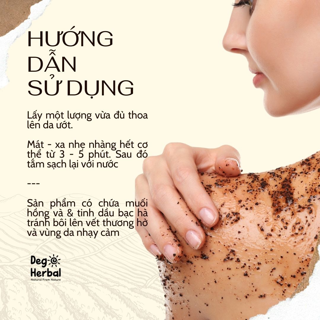💥Thành phần: Cà phê chín cây Đắk Lắk, Dầu hạt mắc ca, Muối hồng, Dầu quả bơ, DM10, Propylen glycol, Glycerin dưỡng ẩm chiết xuất thực vật, Chiết xuất nha đam, Chiết xuất dừa nguồn gốc dầu dừa, Chất bảo quản tự nhiên, Tinh dầu bưởi hồng.