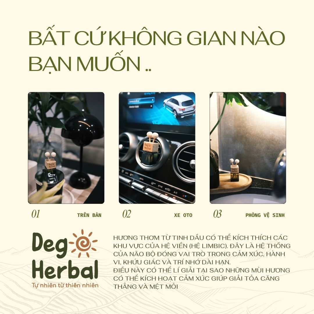 Một vài giọt tinh dầu vào máy khuếch tán, hay đơn giản là treo trong xe hơi, bàn làm việc, tủ quần áo, phòng ngủ… sẽ nhanh chóng biến không gian của bạn trở nên thơm mát, trong lành. Hương thơm tự nhiên này không chỉ giúp khử khuẩn, loại bỏ mùi khó chịu mà còn mang đến sự cân bằng, giúp bạn dễ dàng thư giãn và tận hưởng khoảnh khắc yên bình.